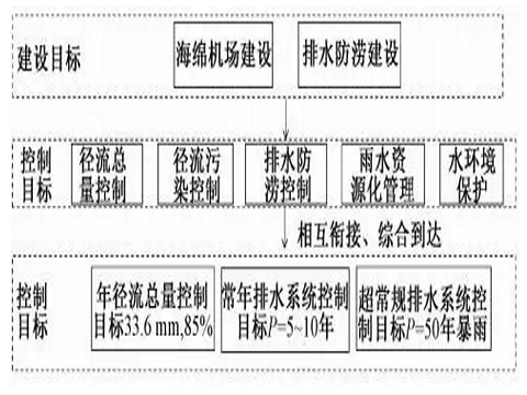 北京新机场根据排水防涝和“海绵机场”建设目标,结合北京新机场水系统的特点,确定径流总量控制、径流污染控制、排水防涝控制、雨水资源化管理、水环境保护为主要综合控制目标(见图2)。