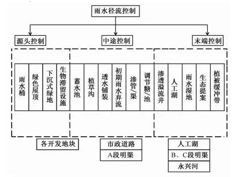 北京新机场“海绵机场”建设涉及场内建筑区域、道路、河湖水体等多种用地类型,应结合区域排水系统规划、水系规划、竖向规划等多项相关规划,并综合考虑各区域与系统间的衔接关系。为落实北京新机场“海绵机场”总体目标,海绵机场雨水系统由源头、中途、末端控制3部分组成(见图3)。